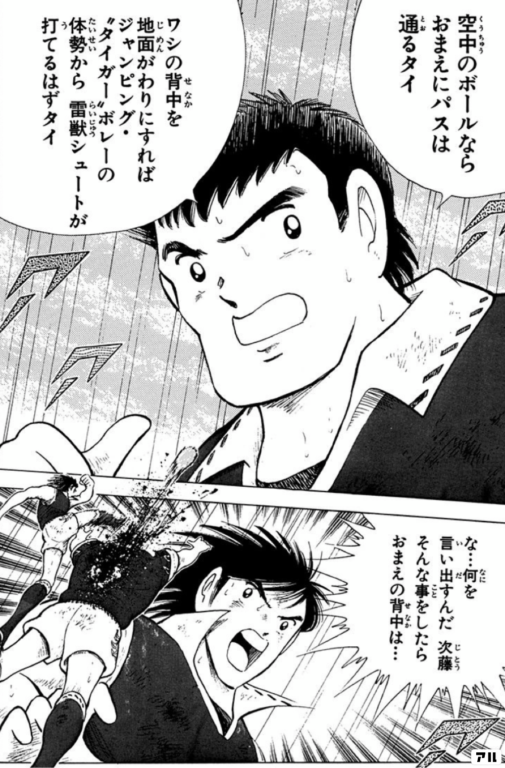 空中のボールなら おまえにパスは通るタイ ワシの背中を地面がわりにすれば ジャンピング タイガー ボレーの体勢から 雷獣シュートが打てるはずタイ な 何を言い出すんだ 次藤 そんな事をしたらおまえの背中は キャプテン翼 ワールドユース編 アル